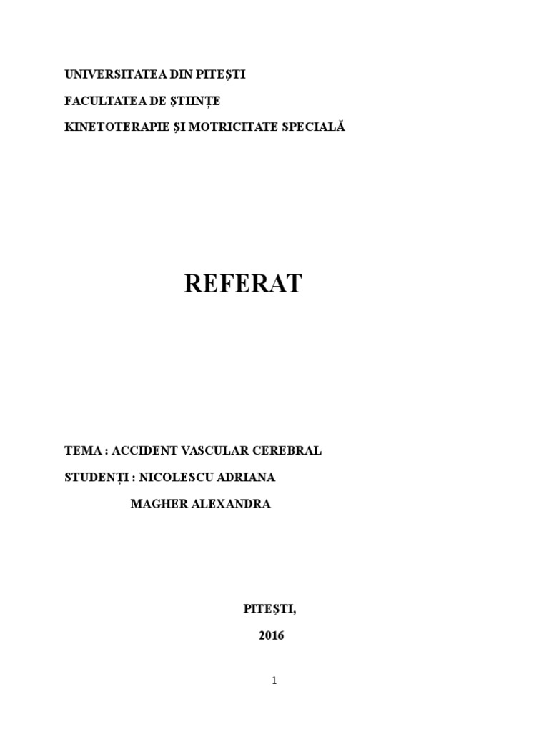 Accidentul vascular cerebral referat. Accidentul vascular cerebral avc generalitati. Accidentul vascular cerebral avc apare atunci când alimentarea cu sânge a unei părți din creier este întreruptă sau redusă privând țesutul cerebral de oxigen și nutrienți. Pentru alte sensuri vedeți atac dezambiguizare. Referatele si lucrarile oferite de referate ro au scop educativ si orientativ pentru cercetare academica.