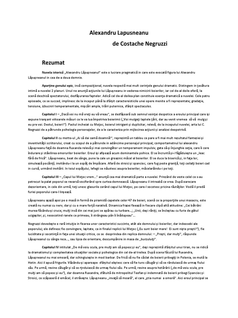 Alexandru lapusneanu costache negruzzi rezumat. Alexandru lăpuşneanul de costache negruzzi rezumat literar nuvela alexandru lăpuşneanul de costache negruzzi apare în revista dacia literară în anul 1840 fiind prima nuvelă istorică românească dar şi o ilustrare a direcţiilor tematice deschise de introducţia lui mihail kogălniceanu pentru înnoirea literaturii. Lăpuşneanu însă le răspunde că el îi vrea şi asta este de ajuns. Tema nuvelei este de factura romantica este evocat destinul unui tiran sangeros alexandru lapusneanu intors la cea de a doua domnie. Unul ne anunţă acţiunile lui lăpuşneanu in vederea nimicirii boierilor iar cel.