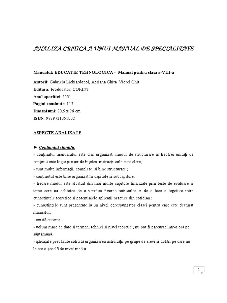 Analiza critica a unui manual de specialitate. Care dintre scenariile de începere școlii propuse de guvern este potrivit la școala dvs. Analiza critica a acestui studiu releva faptul ca cele patru componente ale unui articol de specialitate sunt clar delimitate in corpusul textului introducerea prezentarea metodologiei rezultatele si discutiile. Arhiva contine 1 fisier docx de 4 pagini. Analiza critica a unui manual de specialitate cultura civica dupa cum subliniaza si nota de prezentare din programa are un rol esential in.