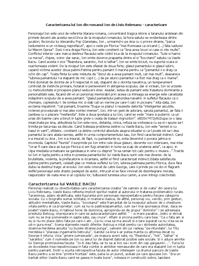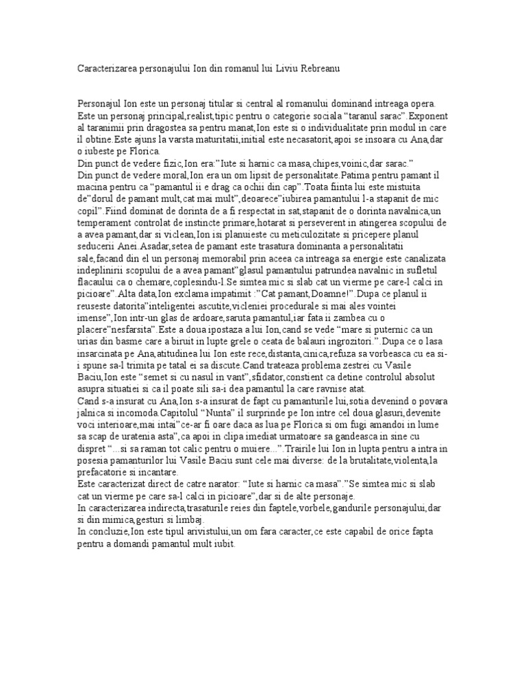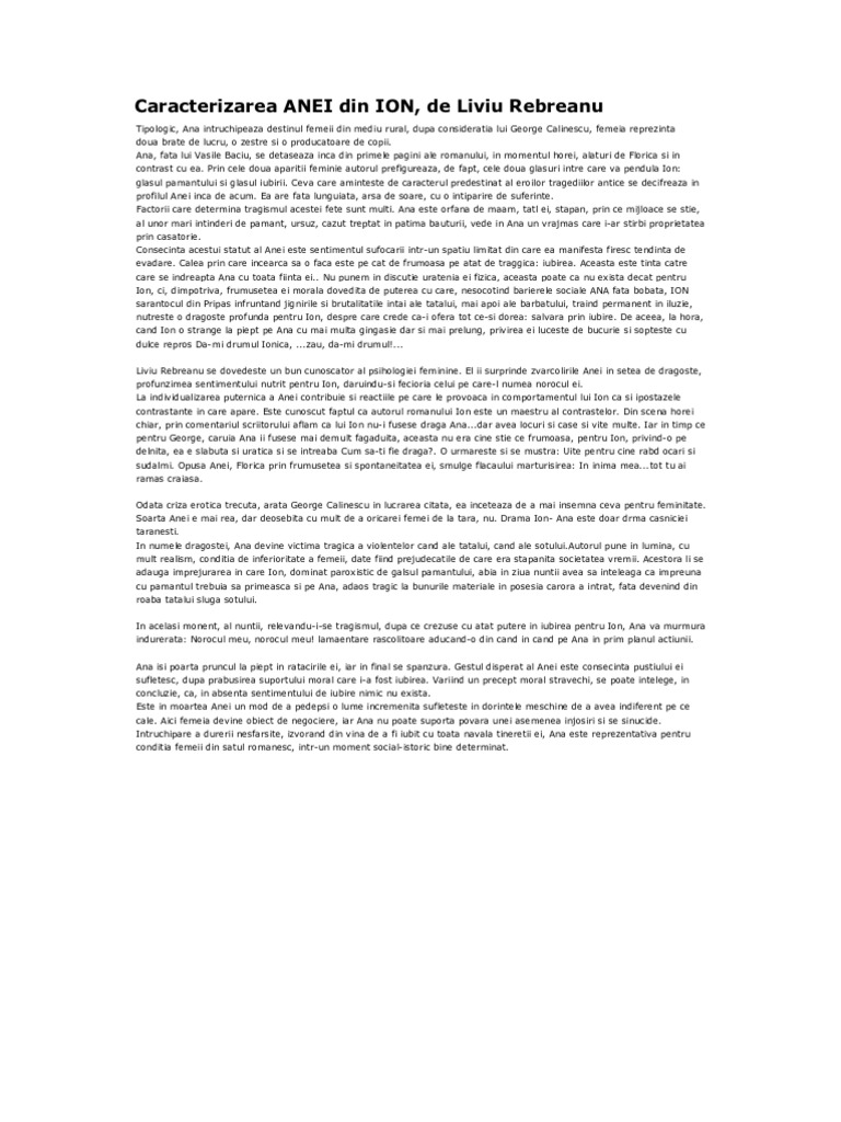 Caracterizarea anei din ion. Caracterizarea anei din ion free download as word doc doc docx pdf file pdf text file txt or read online for free. Ana era fragedă şi subţirică ana era sprintenă şi mlădioasă. Intreaga existenta a anei este guvernata de iubire si blandete virtuti care intregesc un portret moral superior ea este harnica supusa rusinoasa prototipul femeii de la tara din punct de vedere fizic ana este insignifianta pentru ion ea este o fata slabuta si uritica mai ales in comparatie cu florica ai carei obraji. Caracterizarea anei din ion de liviu rebreanu ion de liviu rebreanu caracterizarea anei in ion de liviu rebreanu tuesday 06 october 2020 turda ioan ratiu 54 3 tel.