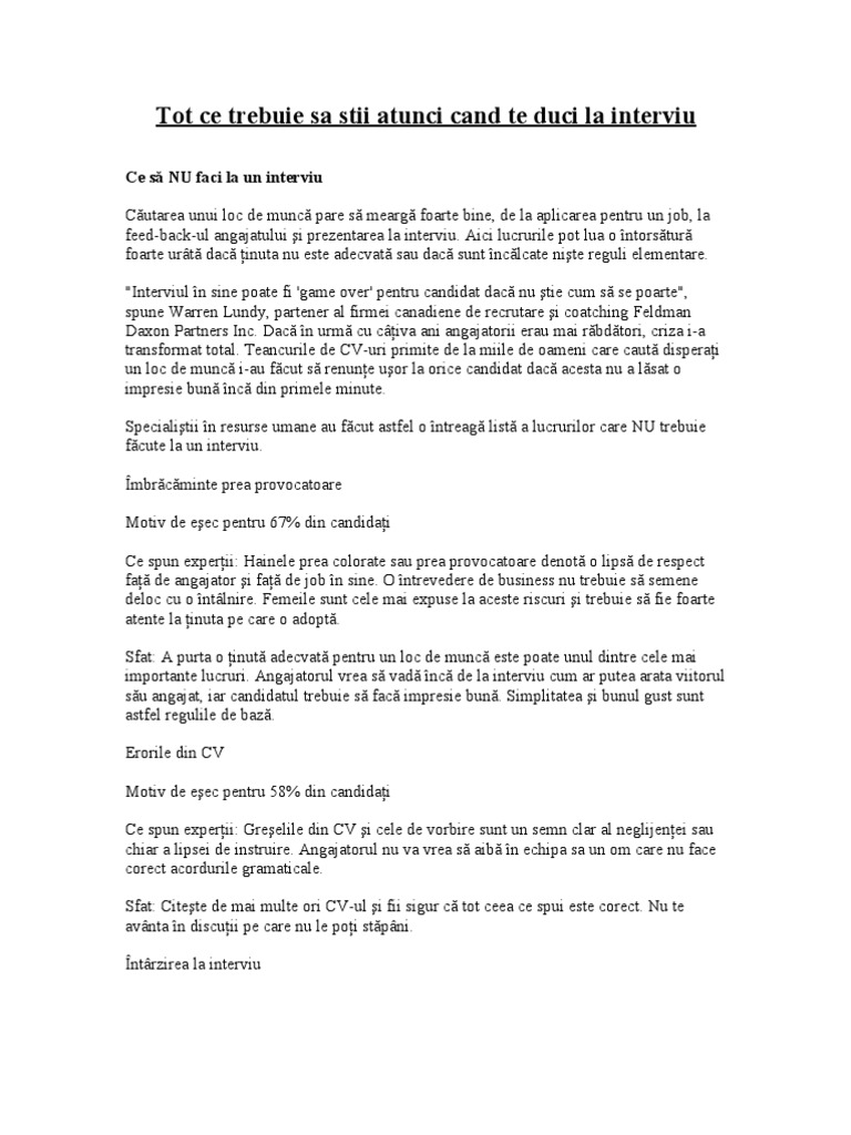Ce trebuie sa faci la un interviu. Nu ți lua un costum sau o pereche de pantofi cu tocuri dacă tu crezi că nu îți stă bine și nu te simți confortabil vino îmbrăcat ă casual smart. La final intreaba daca mai vor sa stie si alte lucruri despre tine si afla care ar putea sa fie urmatorul pas in procesul de angajare. Nimeni nu spune că trebuie să vii la interviu pus la patru ace cu cravată şi ac dar nu trebuie să ai nicio atitudine foarte comună de tipul celei când ieşi cu prietenii. Cu cât faci mai multă cercetare cu atât vei înțelege mai mult compania și cu atât mai bine vei putea răspunde la întrebări.
