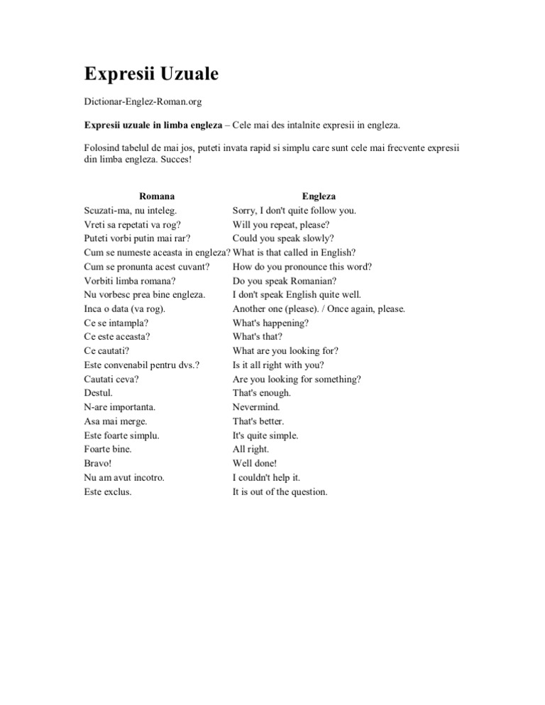 Aici sunt mai multe expresii uzuale în engleză care pot fi de folos în diverse situații. Cele mai uzuale verbe in engleza acest articol contine 40 dintre cele mai uzuale verbe in limba engleza impreuna cu traducerea si pronuntia acestora. Cuvinte expresii des folosite uzuale in engleza texte articole traduse in engleza.