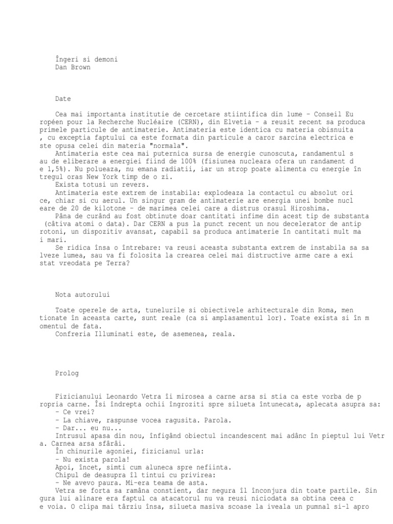 Dan brown ingeri si demoni pdf. îngeri și demoni de dan brown este prima carte din seria robert langdon și este cu siguranță un must read pentru toți amatorii de cărți care te țin în suspans până în ultimul moment. îngeri i demoniş dan brown date cea mai important institu ie de cercetare tiin ific din lume ă ţ ş ţ ă conseil européen pour la recherche nucléaire cern din elve ia a reu it recent s produc primele particule deţ ş ă ă antimaterie. Dan brown ingeri si demoni pdf the enormous amount of hatred towards dan brown the fact that it was written by dan brown and because dan brown s name is slapped on all of the posters.