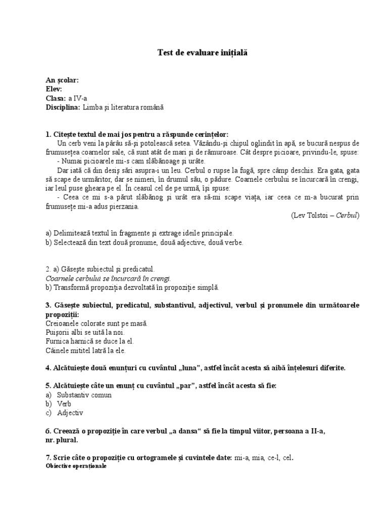 Limba si literatura romana matematica educatie civica si stiinte ale naturii. Evaluare initiala limba romana cls iii a test.