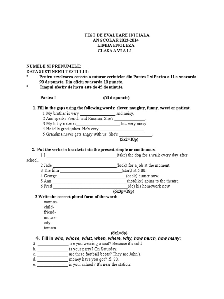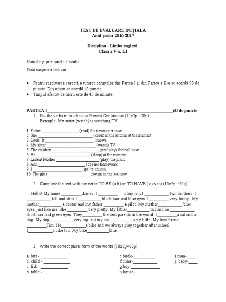 Din oficiu se acorda 10 puncte. Testul de evaluare initiala este adecvat elevilor de clasa a v a urmarind abilitatea acestora de intelegere a unui text in limba engleza de utilizare a prezentului continuu si a formei de plural a substantivelor. Cursuri şcoala online cursuri online primar cursuri online gimnaziu cursuri online liceu profesorul la clasă ghid practic de pedagogie resurse educaţionale interactive revista cadrelor didactice evenimente diplome pentru evenimente. Cuprinde itemi diferiti cu grad de dificultate medie.
