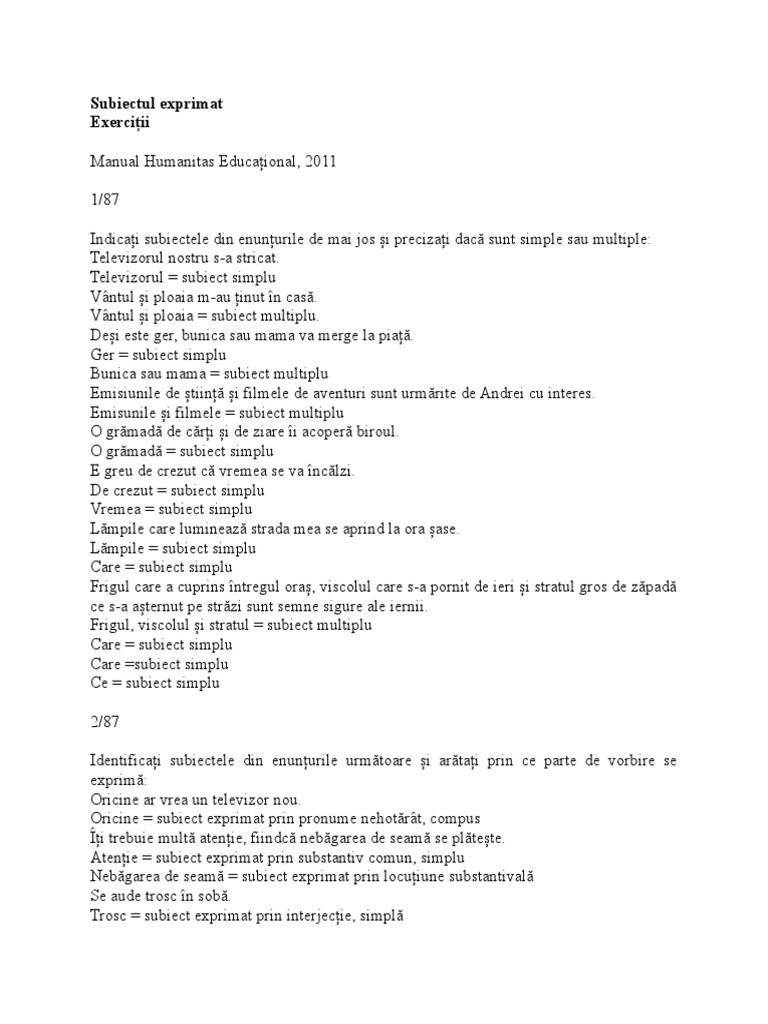 1 televizorul nostru s a stricat. 4 emisiunile de stiinta si filmele de aventuri sunt urmarite de andrei cu interes. Concurentii care au participat la cursa de automobile si organizatorii au primit premii din partea sponsorilor. în timp ce subiectul simplu este constituit dintr un singur cuvânt cel multiplu este format din două sau mai multe părți de vorbire coordonate între ele.