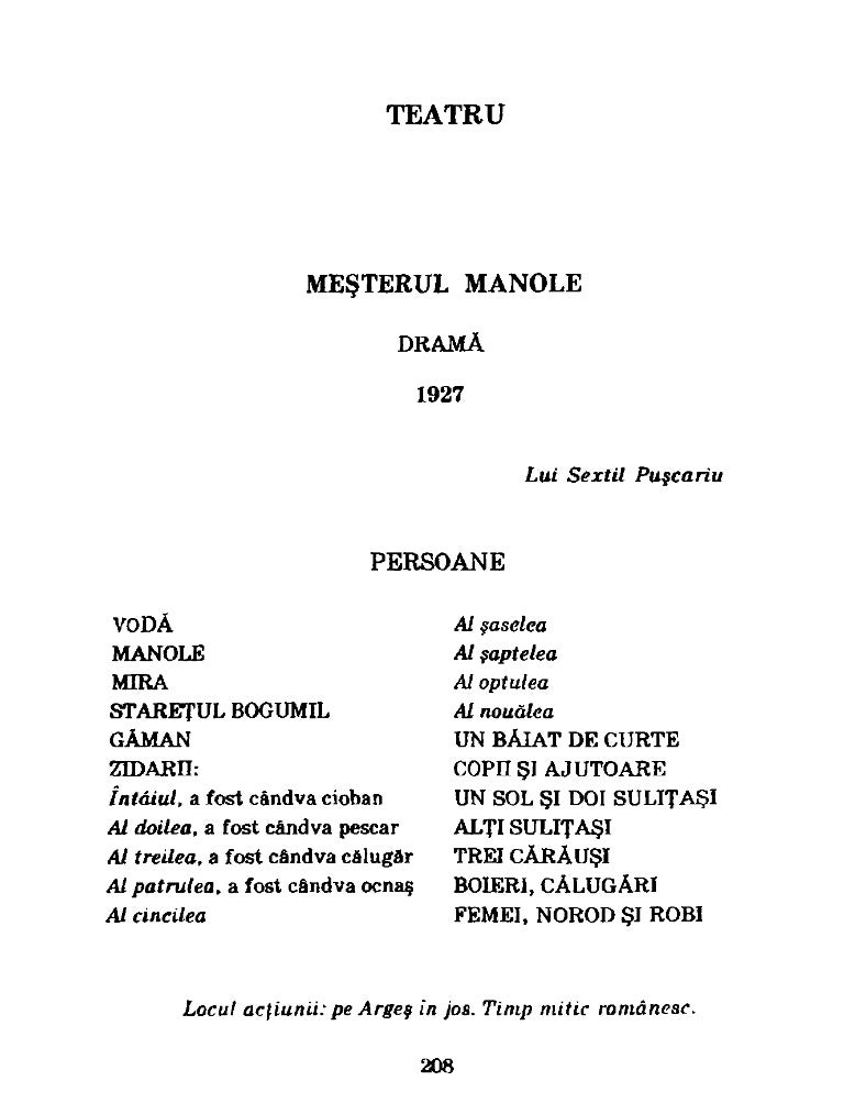 Blaga meșterul manole caracterizarea meșterului manole lucian blaga se personalizează in contextul literaturii române ca un scriitor de excepţie deoarece prin el literatura noastră regăseşte amploarea extraordinară a viziunii asupra naturii spre totul cosmic şi spre sensul lui metafizic pe care le cucerise prin eminescu. Teatru m eşter ul m a n o le dramâ 1927 lui sextil puşcariu persoane vodă manole mira stareţul bogumil gâman zidarn. In blaga s version manole s self sacrifice is not prompted by any gesture of prince radu but it is instead a personal journey. întâiul a fost cândva cioban al doilea a fost cândva pescar al treilea a fost cândva călugăr al patrulea a fost cândva ocnaş al cincilea al şaselea al şaptelea ai optulea al nouălea un bâiat de curte coph şi.