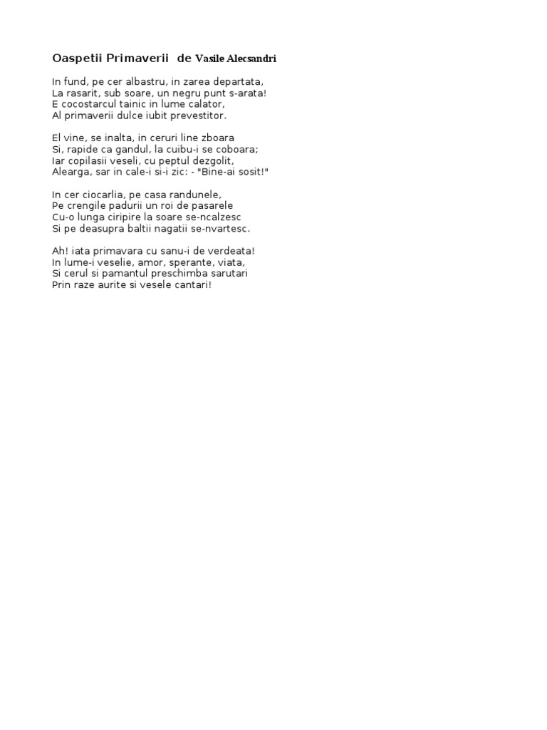 Oaspetii primaverii de vasile alecsandri. E cocostarcul tainic in lume calator al primaverii dulce iubit prevestitor. Oaspetii primaverii de v. In fund pe cer albastru in zarea departata la rasarit sub soare un negru punct s arata. El vine se inalta in cercuri line zboara si repede ca gandul la cuibu i se coboara.