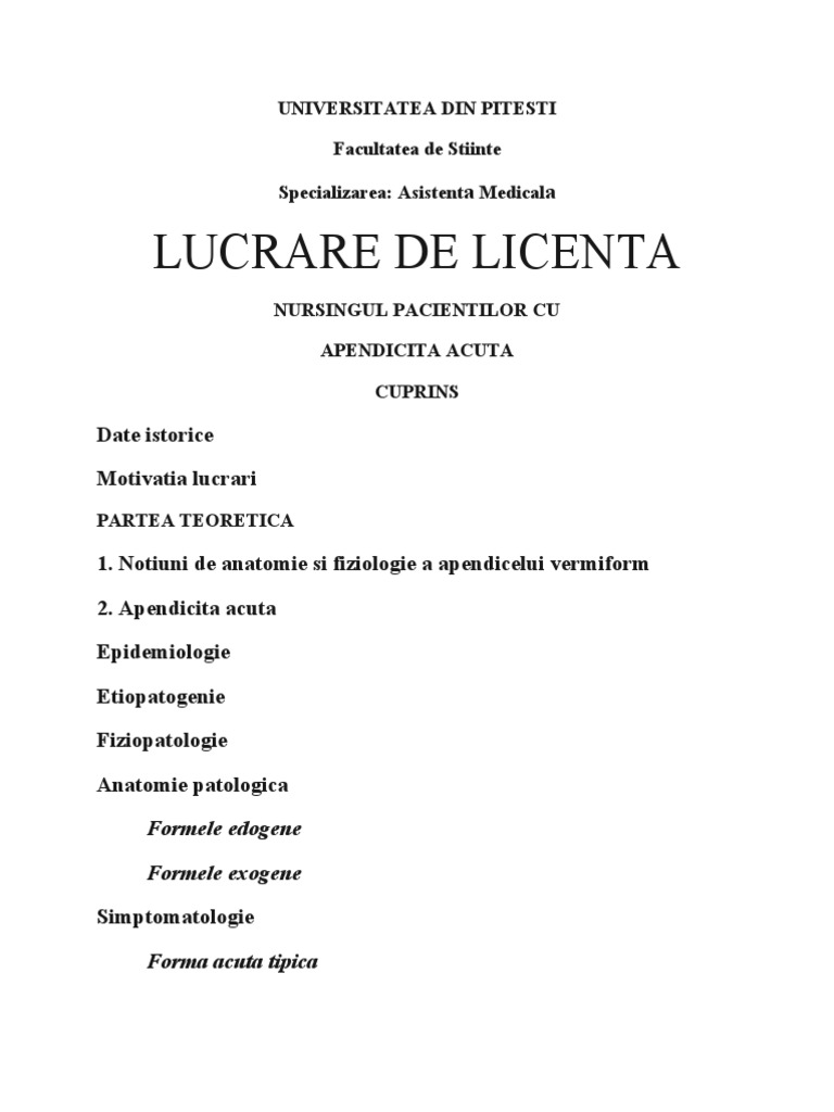 Extras din licenta cum descarc. Acest proiect trateaza ingrijirea pacientului cu apendicita acuta.