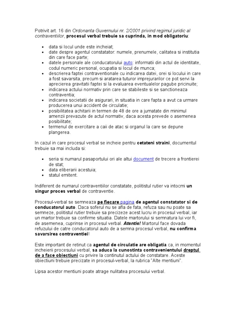 Proces verbal de constatare a contraventiei model completat. în prezent modelul procesului verbal de constatare și sancționare a contravențiilor este prevăzut in oug nr. 118 alineatul 1 din oug nr. 558 2015 pentru aprobarea modelului legitimațiilor al ștampilelor și al proceselor verbale de control constatare și sancționare a contravențiilor utilizate de către inspectorii direcției monitorizare inspecții verificare și control din cadrul ministerului. împotriva procesului verbal de contravenţie seria nr.