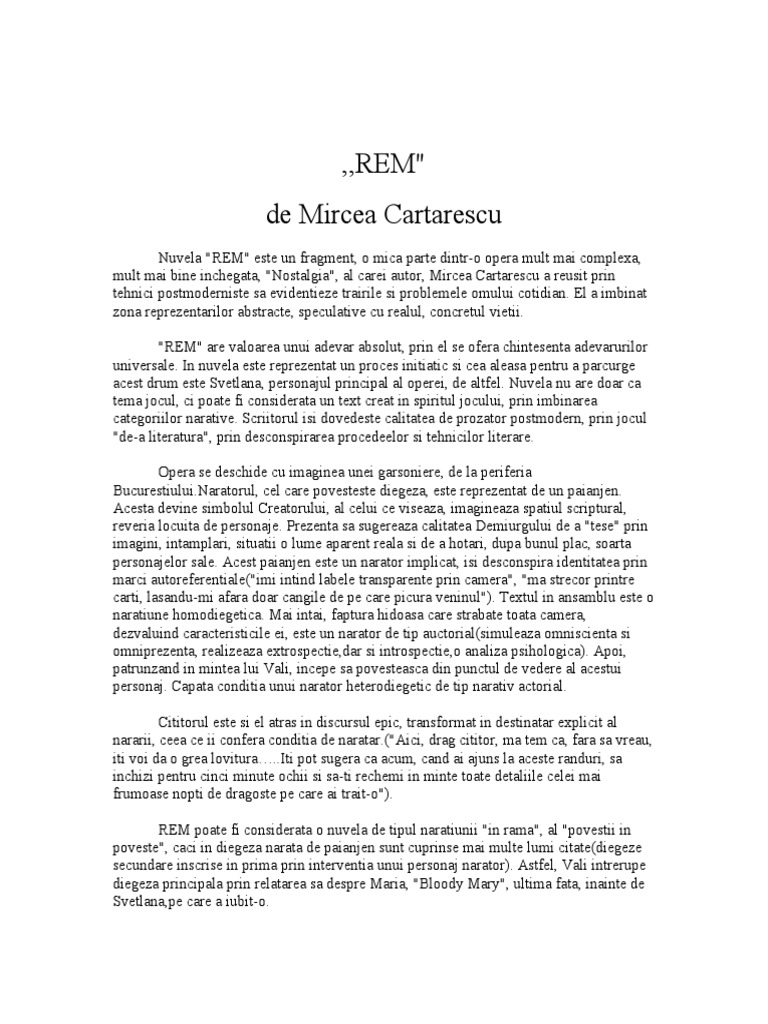 A scris poezii nuvele printre care şi opera în proza rem. Sunt în clasa a ix a în colegiul național ion luca caragiale. Nuvela rem este un fragment o mica parte dintr o opera mult mai complexa mult mai bine inchegata nostalgia al carei autor mircea cartarescu a reusit prin tehnici postmoderniste sa evidentieze trairile si problemele omului cotidian. Referat de aproape 3 pagini word si comentariu literar de o pagina a nuvelei rem prin care mircea cărtărescu a reusit sa evidentieze cu ajutorul temei jocului si a creatiei dorinta si neputinta in acelasi timp al omului de a trai in iluzie intr o lume perfecta pe care si o.