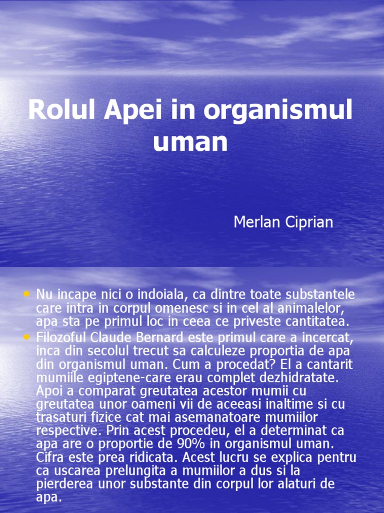 Rolul apei in organism apa reprezinta un excelent dizolvant pentru multe substante si este mediul in care se desfasoara cele mai multe reactii chimice legate de metabolismul substantelor si deci de viata. Miscarea apei in sistemele celulare ale organismului are rolul de a transporta plasma sangvina care este alcatuita 92 din apa. Chimiútii útiu foarte bine ce se.