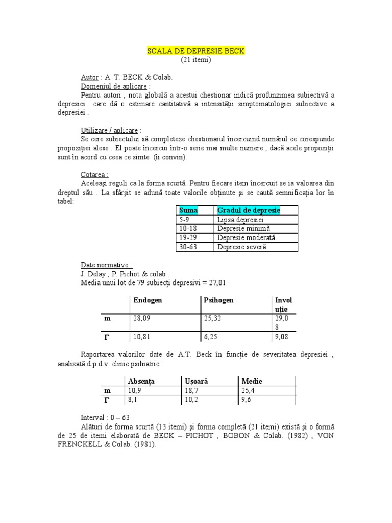 Scala de depresie beck. Este compus din 21 simptome itemi care fiecare este evaluat în patru grade de severitate de la 0 absent la 3 foarte sever fiecărui grad corespunzându i o întrebare iar subiectul este invitat să aleagă acea întrebare al cărui răspuns i se potrivește cel mai bine. Daca credeti ca vi se potrivesc mai multe afirmatii incercuiti numerele propozitiilor corespondente. Aaron temkin beck co. 1961 ca un chestionar care este destinat să evalueze severitatea simptomelor depresive.