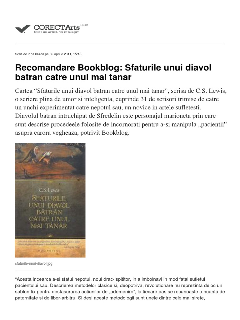 Sfaturile unui diavol batran catre unul mai tanar recenzie. Pur şi simplu the four loves cele patru iubiri precum şi postuma prayer. Letters to malcolm rugăciune. Sfaturile unui diavol batran catre unul mai tanar c s. Sfaturile unui diavol bătrân către unul mai tânăr este totodată un avertisment adresat unei omeniri care respirând scepticismul ca antidot la deziluziile aduse de război romanul apărea în timpul celui de al doilea război mondial a îmbrăţişat religia psihanalizei religia ştiinţei şi a forţei vitale părând să uite că cel ce a dezrobit omenirea de sub stăpânirea demonilor şi s a răstignit pentru iertarea păcatelor a spus şi de atunci ne spune în.