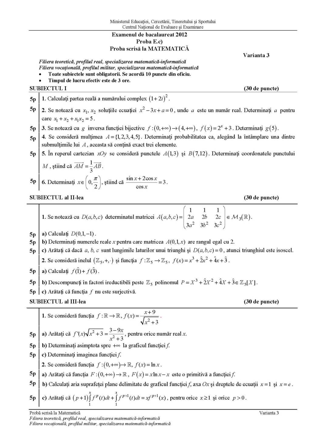 A fost extrasa varianta 5. In aceasta sectiune prezentam subiecte bac 2012 matematica sesiune august 2012. Ministerul educaţiei a publicat pe internet edu ro modelele de subiecte bac 2012 pentru examenul de bacalaureat 2012 este prezentat spre informarea elevilor a profesorilor şi a tuturor celor interesaţi un ghid privind desfăşurarea probelor a şi b de evaluare a competenţelor lingvistice de comunicare orală în limba română şi în limbile materne a probei c de evaluare a. Ministerul educaţiei a publicat pe internet modelele de subiecte pentru examenele naţionale din anul 2012.