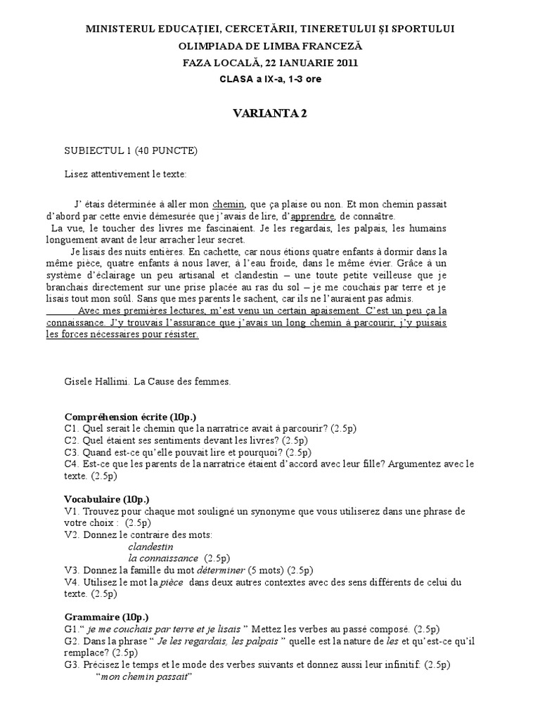 Subiecte olimpiada franceza 2018. Olimpiada limba franceza etapa judeteana. Clasa a x a norm. La linkurile de mai jos găsiţi variantele de subiecte de la olimpiada de limba franceză 2017 clasa a vii a normal. Clasa a viii a normal.