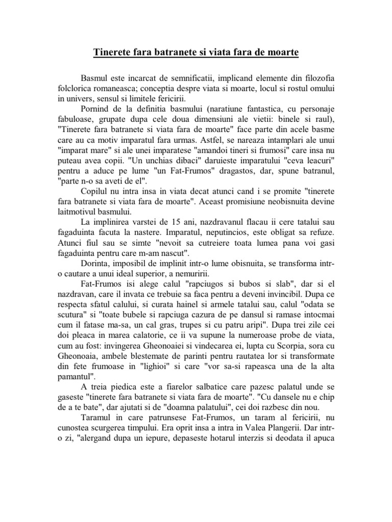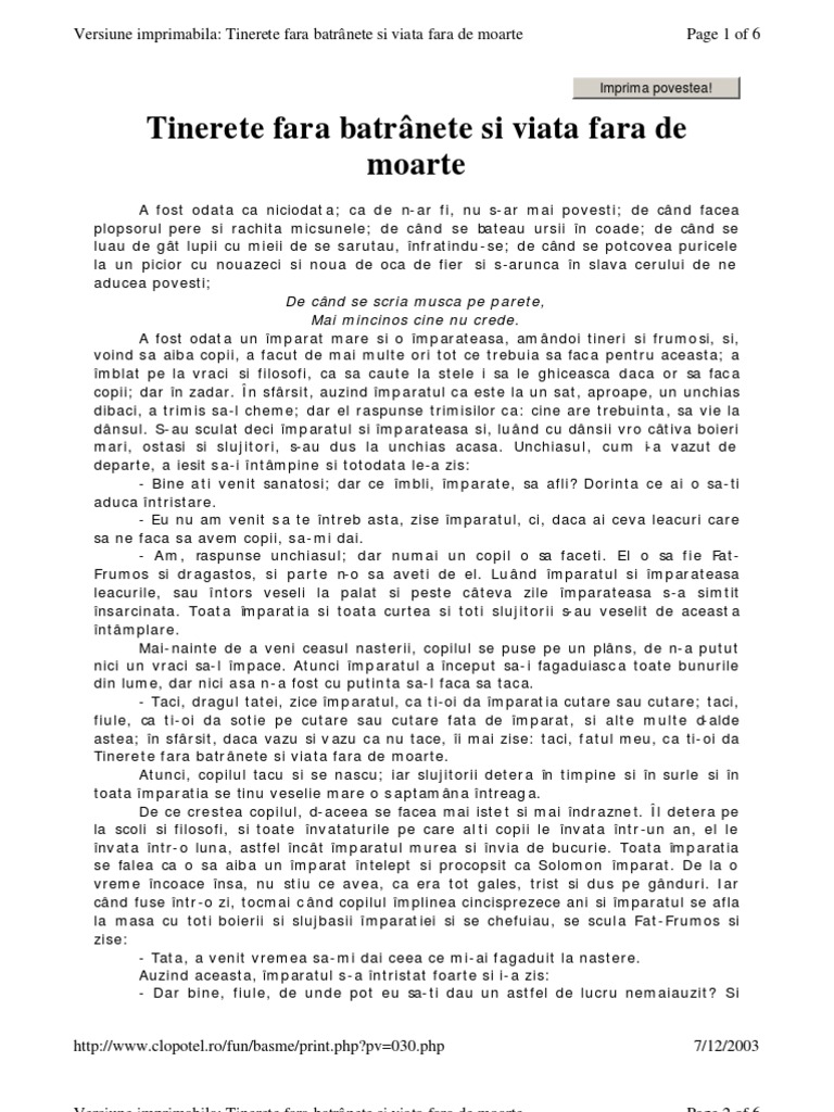 Tinerete fara batranete si viata fara de moarte rezumat scurt. Imparatul neputincios este obligat sa refuze. Tinerete fara batranete si viata fara de moarte rezumat erau odată un împărat și o împărăteasă care nu aveau copii. Printul simtind cum isi. Tinerete fara batranete si viata fara de moarte rezumat basmul este incarcat de semnificatii implicand elemente din filozofia folclorica romaneasca.