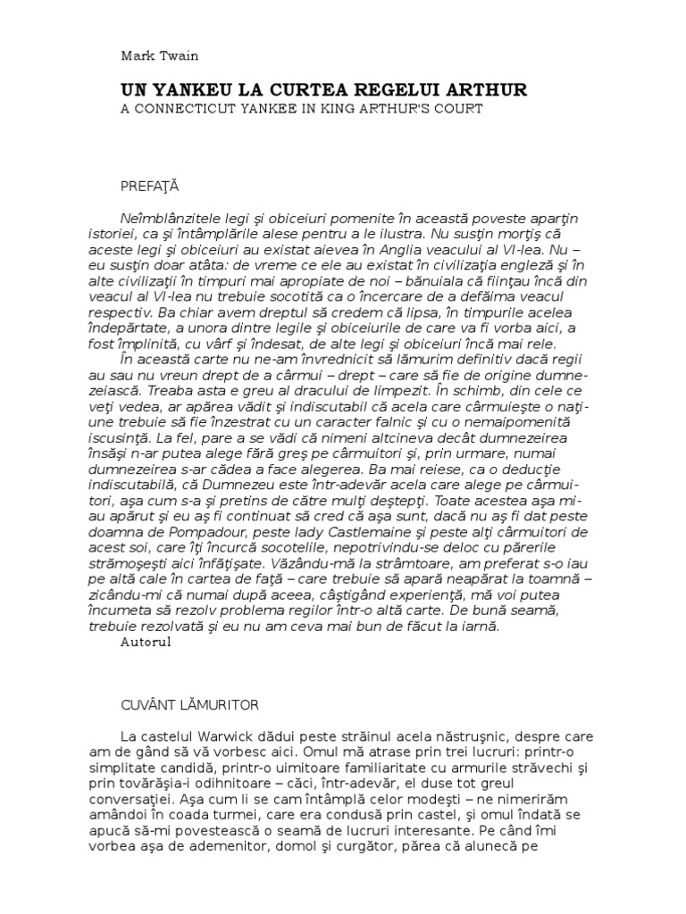 Naratorul întâlnește un om ciudat la castelul warwick. Un yankeu la curtea regelui arthur rezumat mark twain in tinerete acesta a lucrat ca si ucenic de tipograf la varsta de 17 ani scria schite si articole amuzante in 1857 devine ajutorul unui comandant de vapor ce calatorea pe fluviul mississippi timp de patru ani fratele acestuia orion devine in anul 1861 secretar al guvernatorului statului nevada. Povestire pe scurt 1 roman de mark twain. Cred că m am trezit tocmai la vreme ca să scap de spânzurătoare.